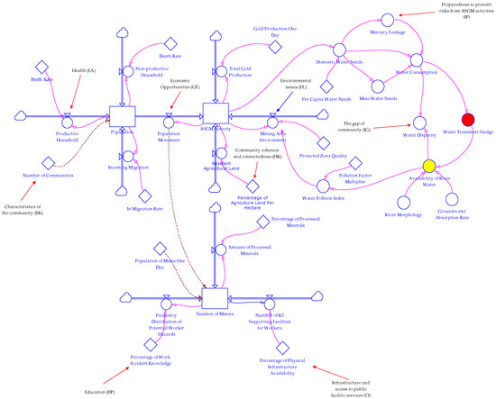 The availability of river water also becomes a dynamic control center point (marked with a light blue circle) representing the morphology of the river and the level of water absorption. It involves the exploration of the indicator value element to determine the prevention factor of ASGM activity. The determinant of water availability is also influenced by the water–pollution index, which represents the multiplier of the pollution factor to determine the quality of the environment around mining. Environmental indicators are the real causality factor in responding to the prevention approach to reduce ASGM externalities. The disabled condition of the environmental sector is endangering the internal aspect and the construction, thereby affecting the resilience of the area concerned.