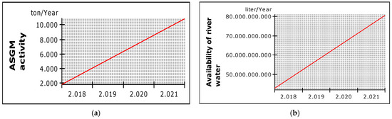The simulation analysis in Figure 6 shows that ASGM activity is very sensitive to changes in river water levels. The special model of the simulation states that the level of ASGM activity reduces the river water quality by 30% to 50% due to the use of mercury, where the dependence of river water for settlements on people’s land has been contaminated with concentrations of mine sludge or so-called water-treatment sludge. This analysis is similar to that of [39]. They described the expansion of extraction of gold material mines and found that it directly affects the accessibility of domestic clean water supplies at a point measuring the amount of material processing on the time axis per day. The sensitivity of the behavioral determinants of simulated ASGM activities to river water availability indicates a 95% water disparity in the consumption of illegal mercury compared with the amount of mercury for gold production that needs to be reported as legal. This finding indicates that part of the process of using mercury that is available for legal mining supplies is only 5% of the total supply for using mercury.