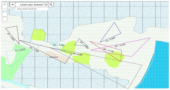 The spatial distribution coefficients in Lantari Jaya are shown by the colored triangular lines. Criteria (γi) = 2,424,894,809.