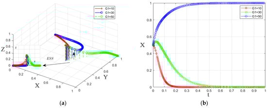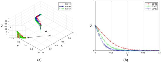 As depicted in Figure 7, when G3 = 10, 30, 50, an increase in the subcontracting company’s concern for their international reputation leads to a shortened evolution process, verifying Inference 4. However, as the subcontracting company continues to focus on their international reputation, the marginal income from the increase in international reputation will gradually decrease.