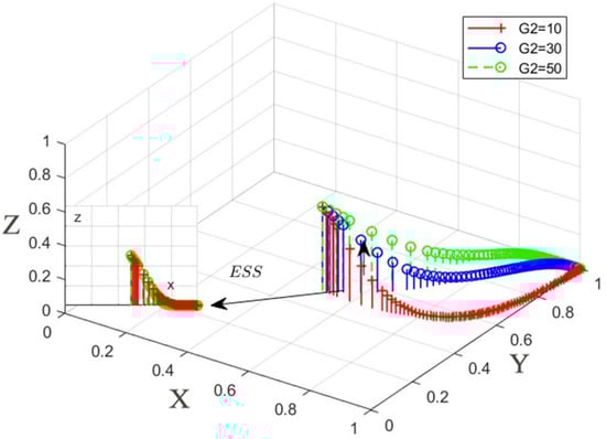 As illustrated in Figure 6, when G2 = 10, 30 and 50, an increase in the supervisory company’s focus on its self-reputation leads to a quicker approach to strategic stability. This result verifies Inference 4. However, as the supervisory company begins to pay more attention to international reputation, the marginal income from the increase in international reputation will gradually decrease.