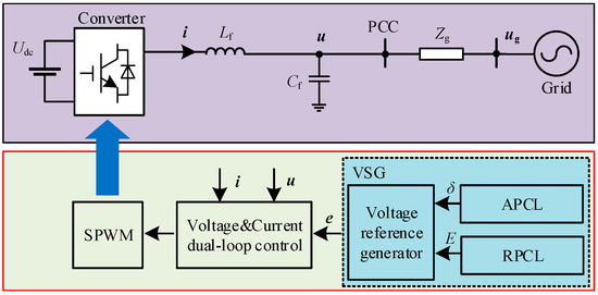 Figure 1 shows the main circuit and traditional VSG control, the VSG-controlled converter port is connected to the LC filter with inductance and capacitance of Lf and Cf, respectively, and then connected to the power grid through the transmission line with impedance of Zg after the PCC point. u and ug are the voltage of capacitance Cf and grid voltage, i is the output current of VSG, and Udc is the DC side voltage. The VSG model consists of the active power control loop (APCL) and the reactive power control loop (RPCL), as shown in Formulas (1) and (2), respectively.