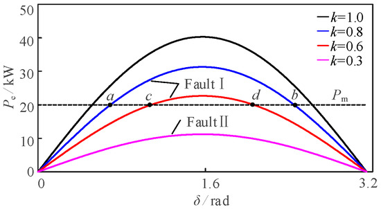 Considering the influence of RPCL, combined with the Pe of Formula (3), the power angle curve of the VSG under different fault degrees k can be drawn as shown in Figure 2, where k is the ratio of the grid fault voltage to the rated voltage. It can be seen from Figure 2 that there are two intersections between Pe and Pm when k = 0.8 and k = 0.6, while there is no intersection when k = 0.3. Points a and c are called stable equilibrium points (SEPs), and points b and d are called unstable equilibrium points (UEPs). If the system crosses the UEP during the fault period, it will lead to transient instability of the system. Therefore, the power angle of the UEP is also critical. To facilitate the analysis, the fault with SEPs during the fault is defined as fault I, and the fault without SEPs during the fault is defined as fault II. Therefore, this paper will focus on two types of faults, k = 0.6 and k = 0.3.