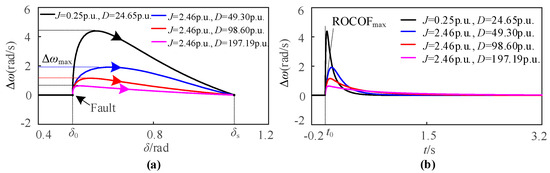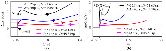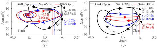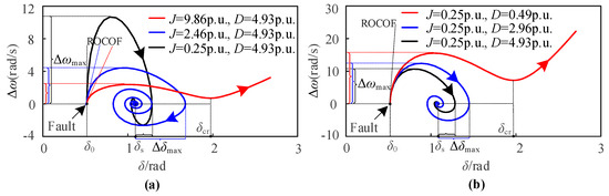 Phase portraits of the VSG with different J and D under fault I. (a) Only J changes (from 0.25 p.u. to 9.86 p.u.); (b) only D changes (from 0.49 p.u. to 4.93 p.u.).