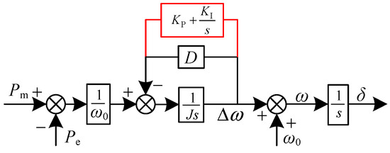 where KP and KI are the proportional and integral coefficients, respectively. Combined with Formula (8), it can be seen that the role of KP is the same as that of D, which increases the system damping and strengthens the anti-interference ability. Because the transient power angle will increase during the fault, according to Formula (8), the increased power angle deviation Δω is introduced into APCL as a feedback term through KI, which can be regarded as reducing the equivalent active reference Pm − KIω0Δδ, thereby reducing the active power imbalance and enhancing the transient stability. It is completely consistent with the method proposed in [6,20,21] to reduce the active command during the fault to enhance VSG transient stability.