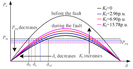 To intuitively analyze the effect of the increase in KI on the transient stability of the VSG, the power angle curve of the proposed control can be drawn according to (3) and (29) as shown in Figure 7. Since Kp and D play the same role in formula (8), Kp = 0 is assumed and only the change in KI is considered. In Figure 7, the black dotted line represents the power angle curve before the fault, and the solid line represents the power angle curve during fault I. It can be seen that when KI increases from 0 to 15.78 p.u. along the arrow direction, the maximum output active power Pe increases, and the equivalent active power command Peq and the transient stability power angle δs decrease along the respective arrow direction. Therefore, the transient stability of the proposed VSG is enhanced, which agrees well with the conclusions in Section 3.1 and Section 3.2.