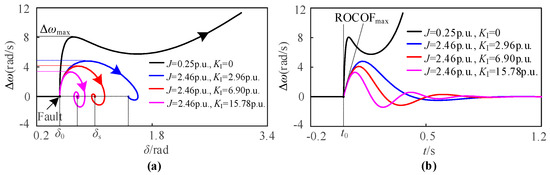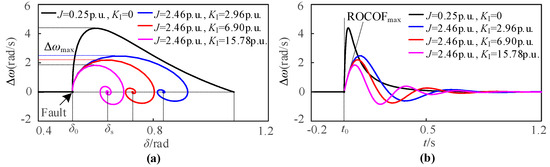According to Formulas (15) and (19), the smaller the damping ratio ζ is, the smaller the Δωmax is, that is, reducing ζ helps to reduce Δωmax. However, the larger the KI is, the smaller the ζ is. Therefore, increasing KI helps to reduce Δωmax.