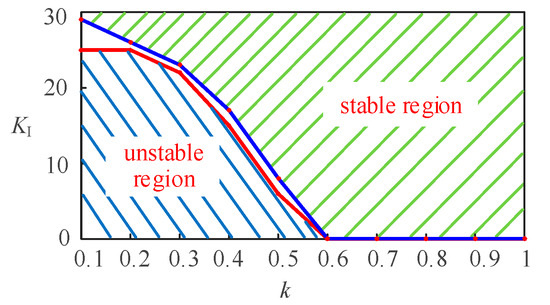 According to Figure 12, the critical stable boundary of the proposed VSG under different k at D = 24.65 p.u. is drawn as shown in Figure 13, where the red line represents the boundary curve formed by each KImin at J = 0.25 p.u., and the blue line denotes the boundary curve formed by each KImin at J = 9.86 p.u. The region with KI > KImin is the stable region, and the region with KI < KImin is the unstable region. In practice, due to the high requirement of the controller’s operation ability for online operation, the optimal parameter table corresponding to different fault k can be made according to the critical stability boundary, and the real-time requirement can be satisfied only by looking up the table.