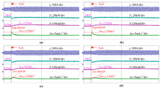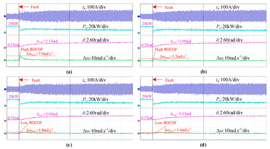 To further reduce the ROCOF of Case1–Case4 and enhance the frequency stability, Figure 19 shows the experimental results of the VSG with high inertia. Compared with Figure 18, Figure 19a–c show that ROCOF decreases significantly with the increase in J, and with the increase in KI, Δωmax decreases from 1.6 rad·s−1 to 1.2 rad·s−1, and δmax decreases from 2.03 rad to 0.62 rad, which indicates that increasing KI can simultaneously enhance the transient stability and frequency stability of the VSG with high inertia.