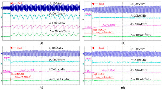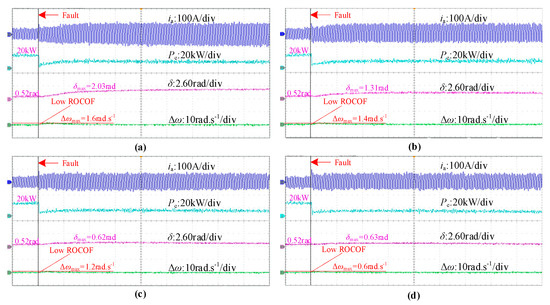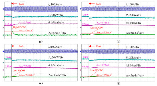 Assuming that D = 24.65 p.u., Kp = 0, KI = 4.93 p.u., J takes four values, namely 0.25 p.u., 0.5 p.u., 4.93 p.u., and 9.86 p.u., respectively. The transient performance of the VSG control is shown in Figure 15. It can be found that the VSG is transiently stable under fault I. With the increase in J, ζ decreases, which leads to the decrease in ROCOF and Δωmax, so δmax decreases from 0.99 rad to 0.91 rad. The experimental results indicate that when the proposed method is adopted, increasing J can enhance the VSG frequency stability and transient stability at the same time.