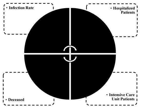 The research model consisted of four SARS-CoV-2-related variables (see Figure 1) as follows: (i) infection rate; (ii) hospitalized patients; (iii) ICU patients; (iv) the deceased. The research model enabled an assessment of the structural properties (i.e., direct, indirect and mediating effects) between them.