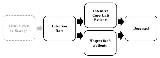 A potential extension of the assessment approach is available at the regional or municipal level, linking analyses that monitor the SARS-CoV-2 levels in sewage (i.e., waste water) at treatment plants to estimate community infection rates (i.e., not the time-delayed 7- and 14-day incidence rates), as shown in Figure 5. This was beyond the scope and reach of this study, as these data are not available at the national level, only for a few larger cities. Nevertheless, we hypothesize that there is most likely a significant relationship between the virus levels in sewage and the infection rate in an extended assessment approach [23,24].
