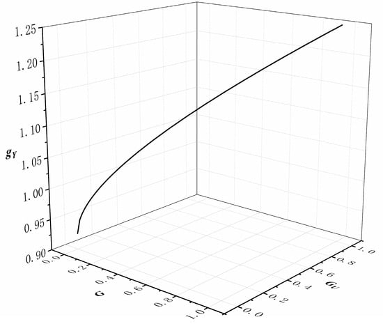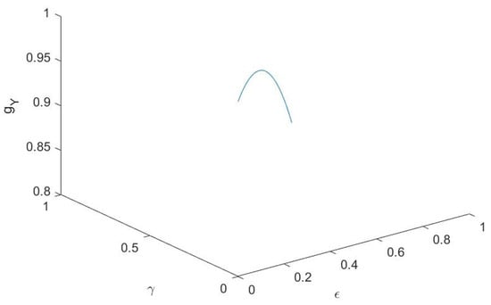 From Figure 3, it can be observed that under the combined effect of the growth rate of cultural capital on the accumulation of human capital, that is, the degree of complementarity between human capital and cultural capital investment and the growth rate of cultural capital , economic growth takes the lead in growth and declines after reaching a certain threshold. This is because with increased cultural capital, the growth rate of cultural capital is also increasing. With improvements in education of firms and residents, firms independently innovate and develop new green low-carbon science and technology, combine big data, artificial intelligence and so on with new green low-carbon science and technology, form a new production and operation model that is digital, intelligent, and green, and then promote consumers’ green low-carbon consumer behavior, so economic growth shows an upward trend, but when green low-carbon science and technology become mature and develop to a certain extent, more human capital will no longer be needed and many people will face the risk of unemployment, resulting in a downward economic trend.
