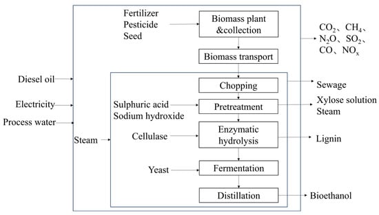 In this study, three types of lignocellulosic biomass (corn cobs, corn straw, and wheat straw) were selected as feedstocks for bioethanol production, and the LCA of these three processes was analyzed and compared. Firstly, the feedstocks are processed and separated to obtain bioethanol, lignin, and xylose, ensuring the full utilization of each component of the biomass and maximizing the value of the products [10]. Subsequently, the bioethanol production process is divided into three stages: the cultivation and collection of raw materials, transportation of raw materials, and ethanol production (chopping, pretreatment, hydrolysis, fermentation, and distillation). The life cycle of each stage is evaluated based on energy benefits (net energy balance and net energy ratio) and environmental benefits (global warming potential, acidification, eutrophication, and carbon reduction). Finally, the economic, energy, and environmental impacts of using lignin as a product versus its use in electricity generation in boilers are calculated and compared. This work offers guidance for seasonal production and theoretical support for the utilization of by-products.