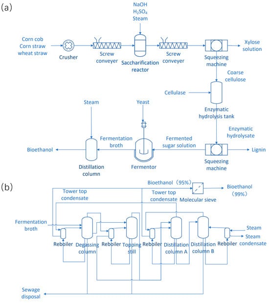 Process flowchart. (a) Ethanol production process flowchart, (b) distillation process flowchart.