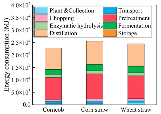 As shown in Figure 3, the energy input for each unit process of bioethanol production is displayed. The energy calculation for each route is derived by summing up the total energy used in raw material cultivation and collection, raw material transportation, and bioethanol production. The energy input for producing bioethanol using corn cobs as a raw material is the smallest (22,797.90 MJ/Mg bioethanol), followed by wheat straw (24,463.94 MJ/Mg bioethanol), and corn straw (25,527.04 MJ/Mg bioethanol), which requires the most energy. This is because the process of producing bioethanol from corn stover requires the most steam, resulting in the input of the most energy.