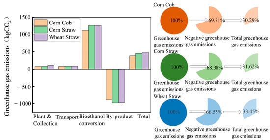 Calculations show that producing 1 Mg of bioethanol from corn cobs, corn straw, and wheat straw emits 1267.58 kg, 1418.36 kg, and 1444.30 kg of CO2, respectively. Comparing these emissions to those of gasoline products (94 gCO2/MJ), the greenhouse gas reductions are 54%, 49%, and 48%, respectively, similar to the 57% reduction calculated by Soam and 52–55% by Zhao et al. [14], and meeting the EU’s sustainability standard of an at least 35% reduction [7]. The calculations do not account for the carbon sequestration effect of the by-products (lignin and xylose). If the carbon content fixed by lignin and xylose is deducted, the reduction in greenhouse gases for bioethanol could reach 82%, exceeding the 60% reduction requirement proposed by the U.S. Environmental Protection Agency (EPA). The distribution of greenhouse gas emissions throughout the entire process of bioethanol production is illustrated in Figure 5.