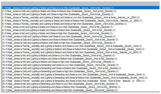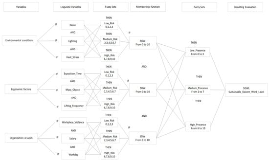 Therefore, 108 rules were determined, 27 for each variable, including the resulting evaluation, as is shown in Table 1. All combinations of the linguistic variables through the IF, AND, and THEN represent the inference stage to define the level of SDW for each work condition.