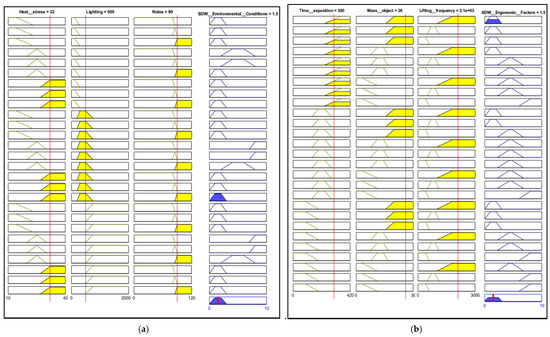 Individual evaluation by a set of linguistic variables: (a) ruler viewer for environmental conditions, with an SDW resultant score of 1.5; (b) ruler viewer for ergonomic factors, with an SDW resultant score of 1.5. Both cases indicate the absence of SDW. The yellow vectors indicate the rules that have been activated for each linguistic set, while the blue vector represents the SDW level (the resulting evaluation). The red line on the vectors corresponds to the value inputted for each linguistic variable.