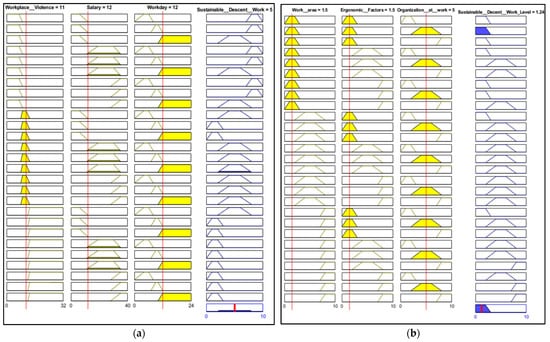 Individual evaluation by a set of linguistic variables: (a) ruler viewer for the organisation at work with an SDW resultant score of 5, indicating some features of SDW; (b) ruler viewer for the final SDWL, with a resultant score of 1.24, indicating the absence of sustainable decent work. The yellow vectors indicate the rules that have been activated for each linguistic set, while the blue vector represents the SDW level (the resulting evaluation). The red line on the vectors corresponds to the value inputted for each linguistic variable.