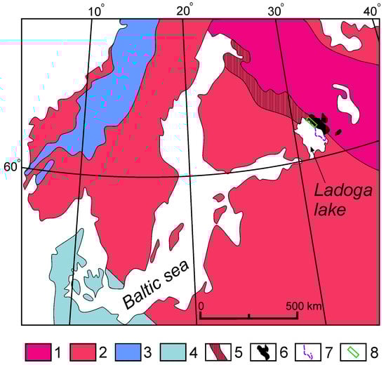 Schematic geological map of the location of the Pitkäranta area, compiled by the authors taking into account the material presented in [10,18,19]. 1, Arhean Karelia province; 2, area of the Svecofennian orogen; 3, area of the Kaledonian orogen; 4, rocks beyond the East European craton; 5, Raahe–Ladoga zone; 6, anorthosite–rapakivi granite-bearing complex (ARG); 7, boundaries of the ARG complex rocks under Lake Ladoga; 8, Pitkäranta area.