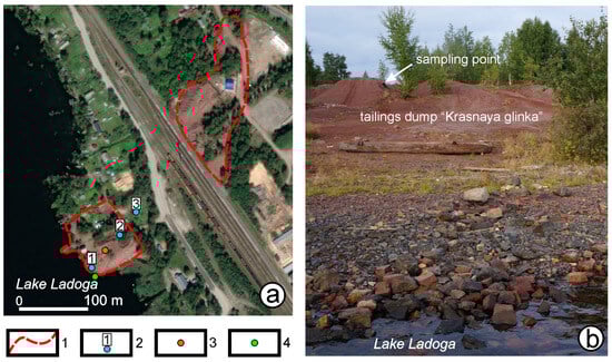 Sampling. (a) Scheme of sampling: 1—visual borders of dump; 2—water sampling points; 3—sampling point of dump materials; 4—point of view for (b). (b) View from the shore of Lake Ladoga of the tailings dump and sampling point of dump materials.