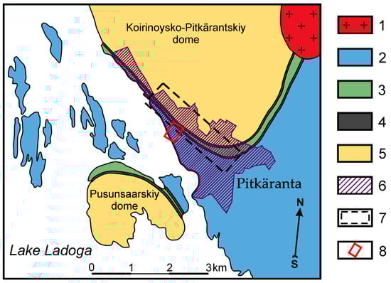 Geological scheme of investigation area, compiled by the current authors with consideration of the material presented in [21]. Legend: 1—granites of Salmi batholith; 2—Ladoga formation (PR1) biotite–quartz and quartz–feldspar–biotite schists; 3—amphibolized basalts and gabbro-amphibolites with interlayers of graphite containing quartz–feldspar–biotite schists, Sortavala group (PR1, Pitkäranta suite); 4—skarnified marble, pyroxene and garnet skarns, Sortavala group (PR1, Pitkäranta suite); 5—the AR2-PR1 domes are mainly gneiss–granite; 6—area of modern Pitkäranta city; 7—area of “Old Mine Field”; 8—area of location of tailings dump “Krasnaya Glinka”.