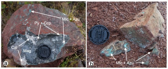 Large fragments of skarnified marble at the base of the dump with copper hydrocarbonates developing along them. Abbreviations: Py—pyrite; Ccp—chalcopyrite; Cal—calcite; Mag—magnetite; Mlc—malachite; Azu—azurite. (a) With a fresh chip on which pyrite and chalcopyrite are visible and (b) without a chip.