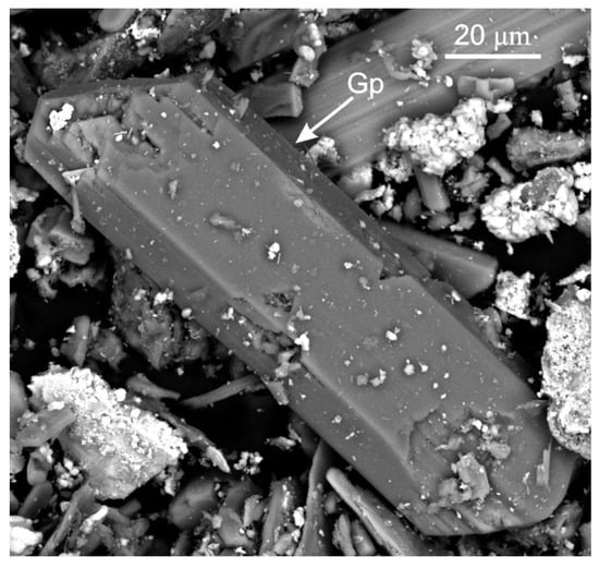 Newly formed gypsum (Gp) crystals from the fraction less than 0.1 mm, BSE (backscattered electrons).
