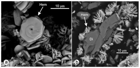 Barite was probably found as small units, but the insignificant size of the secretions cannot provide reliable proof of the presence of this mineral. Clay minerals are thin leather coats of non-permanent composition; it is impossible to reliably identify them using the available analytical methods. Saponite is noted from the identified compounds. Hematite forms thin lamellar crystals fused in the form of “rosettes” (Figure 6a). Accretions of hematite often form crusts around the cores of coarse-grained silicate minerals (Figure 6b).