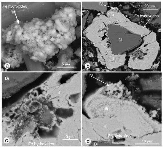 The structural features of the Fe-hydroxide aggregates, BSE. I, II, III, IV—stages of aggregate growing. (a) The outer shape of the Fe-hydroxide aggregates; (b) the internal structure of the Fe-hydroxide aggregates fouling a grain fragment of diopside (Di); (c) stage I, with traces of dissolution of mineral phases; (d) stages II, III, and IV.