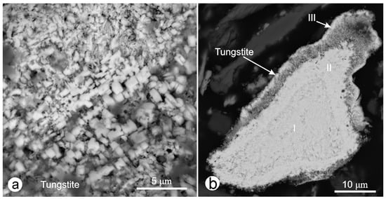The minerals of the tungstite group are represented by fine-crystalline aggregates that develop separately from other formations (Figure 8a). These aggregates can have a different size range and also fall into fractions larger than 0.1 mm. Fouling of the tungstite aggregates upon the silicate mineral cores was not observed. Some mineral aggregates of the tungstite group minerals also show a complex, multi-stage history of formation, as do Fe-hydroxides. Unfortunately, it was also not possible to identify a uniform growth pattern for all entities.