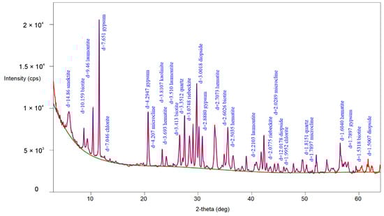 The XRD studies have shown the following mineral composition: smectite with Mg-exchange complex 9%; mica (mainly biotite) 5%; zeolite (mainly laumontite) 5%; chlorite 2%; quartz 2%; K-feldspar 9%; amphibole 9% (mainly riebeckite); gypsum 24%; pyroxene (mainly diopside) 18%; and hematite 17%. The spectra of the analyzed samples are presented in Figure 9. The data obtained with XRD are presented in the Supplementary Materials (Table S3).