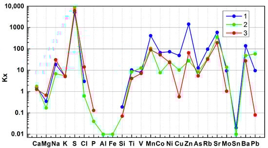 The major elements and the Cr, V, Co, Ni, Cu, Zn, Rb, Sr, Zr, Ba, Pb, As, Cl, Mo, W, Ta, and Sn contents and their different fractions in the samples of materials obtained from the dump were determined using X-ray fluorescence at the Institute of Geology of Ore Deposits, Petrography, Mineralogy, and Geochemistry of the Russian Academy of Sciences (IGEM RAS, Moscow, Russia) by Yakushev A.I., using a WD spectrometer (Axios mAX; PANalytical, Almelo, The Netherlands). The spectrometer was equipped with an X-ray tube with a 4 kW Rh anode. The maximum-rated tube voltage of this equipment is 60 kV with a maximum anode current of 160 mA. For the calibration of the spectrometer, industry and state standard samples of the chemical compositions of rocks and ores were used. The quality control of the analytical results was performed on standard samples of rocks from the US Geological Survey (USGS), Denver, CO, USA. All Fe was determined via XRF as Fe2O3.