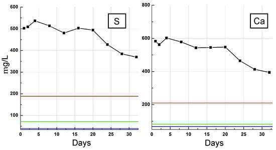 - A rapid increase in the content of elements in the solution in the first 4 days, followed by a decrease in their content: S and Ca (Figure 11).