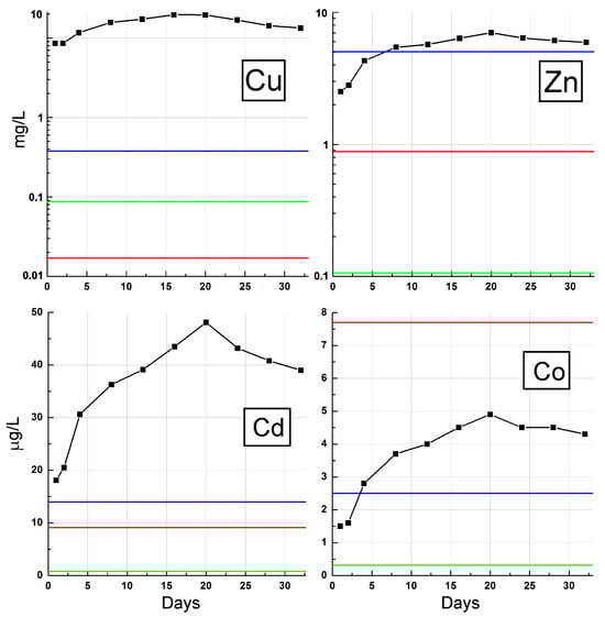 Figure 12. The change in the concentrations of Cu, Zn, Cd, and Co over the time of the experiment. Horizontal lines—concentrations of the same components in water sample 1 (blue), water sample 2 (green), and water sample 3 (red). - The content of elements in the solution reaches a plateau in the first 4 days, and their content either increases slightly until the end of the experiment or increases sharply after the 20th day of exposure: Na, K, Mg, Ba, Pb, and Li (for Li, this behavior is less pronounced) (Figure 13).