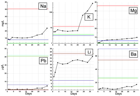 Figure 13. The change in the concentrations of Na, K, Mg, Pb, Li, and Ba over the time of the experiment. Horizontal lines—concentrations of the same components in water sample 1 (blue), water sample 2 (green), and water sample 3 (red).