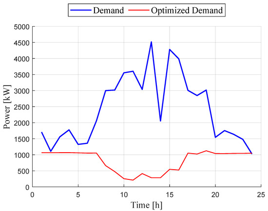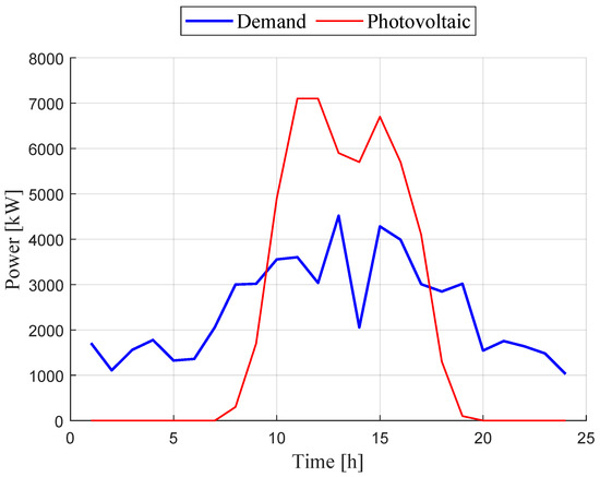 Figure 2 shows the initial demand curve of the case study, with a peak of 4.5 kW and a minimum power of 1 kW, with an increase in demand from 07:00 with a peak of demand from 14:00 to 16:00. The red color indicates the curve of the photovoltaic system, this curve shows the average data for a year, where it supplies a maximum power of 7 kW between 09:00 and 16:00 h.