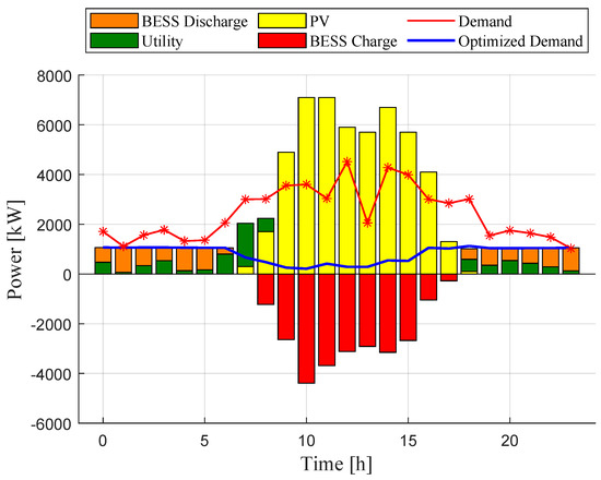 The microgrid system can operate in four different ways: (1) using the PV system to charge the BESS, (2) using the PV system to deliver power to the grid, (3) using the BESS to deliver power to the grid or microgrid, and (4) using the grid to charge the BESS. In the first part, when there is enough radiation, the PV system can charge the batteries of the BESS. In the second part, when there is overproduction of energy, and the BESS is fully charged, the energy produced by the PV system can be delivered to the national grid [33]. In the third part, when solar power is scarce and the PV system cannot generate enough power, the BESS can deliver power to the grid or microgrid. In the fourth part, when the peak demand is high, to avoid power shortage in the microgrid, the grid can charge the BESS [20,32].