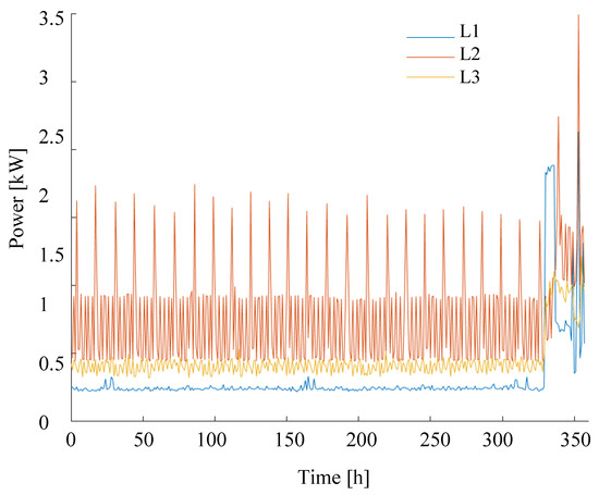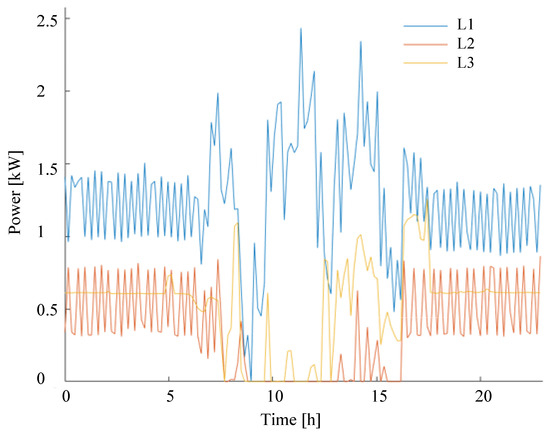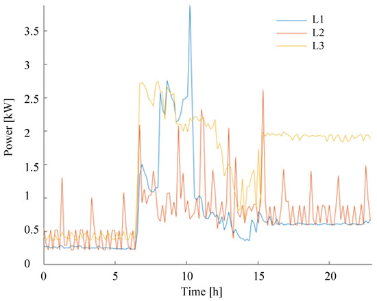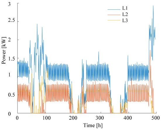 In Figure 5, The initial electricity demand profile of the microgrid system is shown for a three-phase feeder (L1, L2, L3) serving block H over a 7-day measurement period before applying the optimization model. The microgrid has a baseline peak demand of 4.5 kW on each phase, occurring between 7 AM and 4 PM. This maximum demand is indicative of the consumption from residential loads in the mornings and afternoons. During late night, a minimum base demand of 1 kW is observed on each phase, likely serving essential loads. The three-phase demand profiles exhibit similar consumption trends, with peak demand in the afternoons driven by increased usage from households. By optimizing the microgrid operations through demand response and distributed energy resources, the peak loads can potentially be reduced while still serving the daily energy needs. The optimization results can be compared to this initial 7-day demand profile to quantify the impacts of the model. The multi-phase demand data at 10-min intervals provide insights into the microgrid flexibility and where peak shaving measures can be targeted. Further analysis may reveal additional observations comparing the three phases or comparing weekday and weekend usage profiles before optimization.