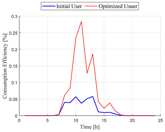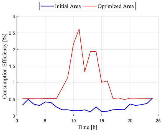 Figure 9 shows that once the demand curve is optimized, the quality indicators are analyzed according to the area and energy consumed, where the initial curve shows a low efficiency, with the highest efficiency points at night. At the same time, after applying the management model, there is a substantial improvement of two points during working hours, i.e., from 07:00 to 15:00.