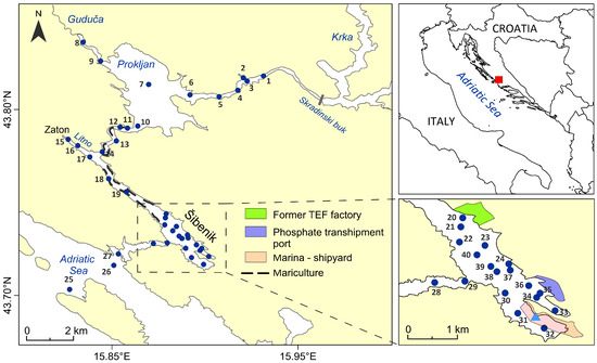 In this study, the above-described approaches were applied to assess the sediment quality and ecological state of a typical highly stratified Mediterranean estuary. The Krka River estuary is a marine protected area (MPA) and a well-known site for mussels and fish farming. Most of the Krka River’s freshwater section is protected as a national park, meaning that there is negligible human pressure in the area upstream of the estuary. As a result, the freshwater entering the estuary, as well as the estuarine water, is extremely clean in terms of trace metals [28,29]. In the sediments of the lower Krka River estuary, however, several studies have found elevated quantities of Hg [30,31] and Cd, Pb, Cd, and Cu [32,33,34]. The increased concentrations in this part of the estuary are most probably related to the human activities within the Šibenik Bay, i.e., to the untreated wastewater discharge, the ferromanganese industry, repair shipyard, and phosphate transshipment port. Currently, some of the sources are eliminated; wastewater has been treated and discharged in the open sea since 2007, and the electrode and ferroalloy factory (TEF factory) was closed nearly three decades ago. However, the removal of industry from the estuary resulted in the growth of nautical tourism, which poses a new anthropogenic threat to the estuarine ecosystem [28,35]. Concerning elevated concentrations reported previously in the Krka River estuary and changes in contamination sources, a detailed study was conducted in order to (1) determine the spatial distribution of metals in surface sediments, (2) evaluate the degree of recent sediment contamination, and assess the potential ecological risk of these metals to the estuarine environment, and (3) establish the relationship between metal concentrations and possible anthropogenic sources. Given that the Krka River estuary is a marine protected area (MPA), the results of this study will be of great importance to stakeholders and local authorities because they will provide essential information for the strategic design of future pollution control and sustainable management of the MPA.