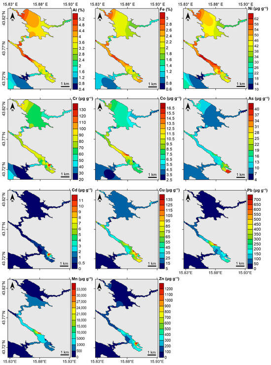 Metal concentrations in the surface sediment from the Krka River estuary were found in the following ranges: 0.545–5.29% (Al), 0.647–1.94% (Fe), 11.3–63.4 μg g−1 (Ni), 20.7–129 μg g−1 (Cr), 2.52–16.1 μg g−1 (Co), 5.43–39.6 μg g−1 (As), 0.11–11.2 μg g−1 (Cd), 37.6–1200 μg g−1 (Zn), 18.0–665 μg g−1 (Pb), 128–32037 μg g−1 (Mn), and 5.25–132 μg g−1 (Cu) (Figure 2, Table S3).