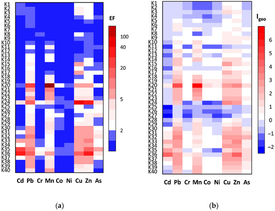 Calculated enrichment indices for surface sediments (0–5 cm) from the Krka River estuary: (a) enrichment factors (EF); (b) geoaccumulation indices (Igeo).