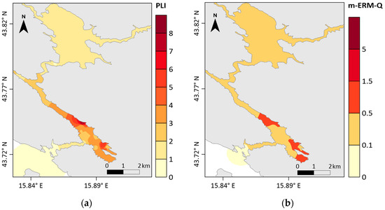 (a) Spatial distribution of the pollution load index (PLI) in the surface sediment of the Krka River estuary. Values <1 indicate no pollution, whereas values >1 indicate polluted sediment; (b) Spatial distribution of the mean ERM quotients (m-ERM-Q) in the surface sediment of the Krka River estuary (on the right). The classes of toxicity probability for biota are defined as m-ERM-Q < 0.1, 9% probability of toxicity; 0.11–0.5, 21% probability of toxicity; 0.51–1.5, 49% probability of toxicity; and >1.51, 76% probability of toxicity.