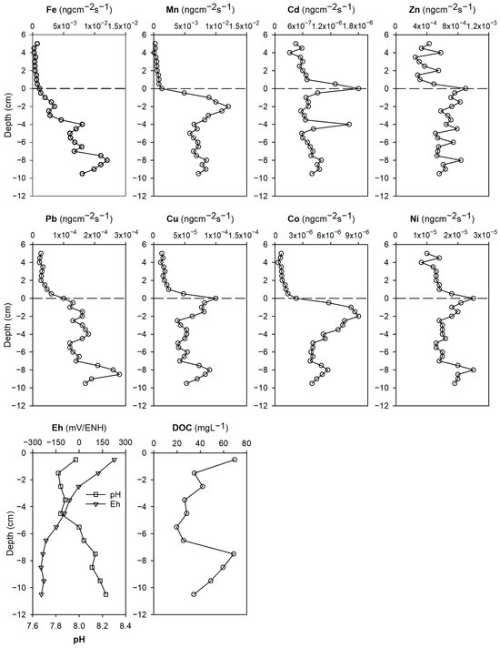 DGT profiles of Fe, Mn, Cd, Zn, Pb, Cu, Co, and Ni measured in the sediment in the Krka River estuary (marina—shipyard area). Vertical profiles of pH, Eh, and dissolved organic carbon (DOC) in the pore water of the sediment core sampled at the DGT deployment site.