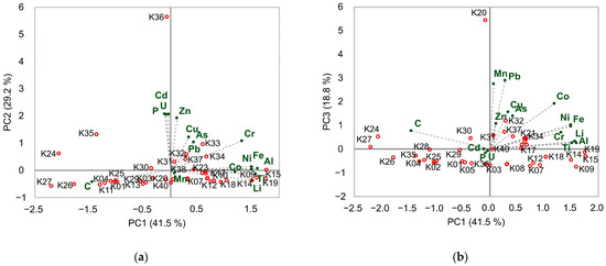 The principal component analysis (PCA) biplots of the 16 elements measured in the 40 surface sediment samples from the Krka River estuary. (a) PC1 versus PC2 and (b) PC1 versus PC3 are shown. Red circle symbols represent sampling points. Labels are given for 31 of 40 points, due to clarity reasons.