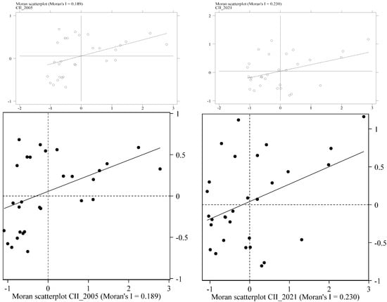 The Moran scatter plots for China’s provincial-level carbon imbalance indices in 2005 and 2021 are depicted in Figure 2. The horizontal axis represents the standardized carbon imbalance indices for each province, while the vertical axis signifies the spatial lag values of the carbon imbalance indices for each province. It is evident that the majority of provinces fall within the spatially positive correlation regions in quadrants one and three on the scatter plot, with the spatial fit line traversing these quadrants. This indicates that regions with higher carbon imbalance indices tend to have neighboring regions with similarly high carbon imbalance indices, and likewise for regions with lower carbon imbalance indices, suggesting a spatial clustering tendency.