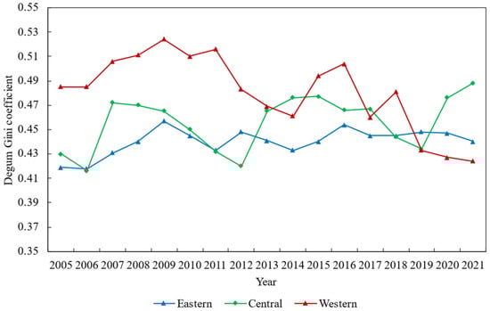Table 5 presents the results of the decomposition of China’s carbon imbalance based on the Gini coefficient. It is noticeable that after China’s entry into the World Trade Organization, the vast market space led to vigorous economic development. The rapid and robust economic growth brought about substantial carbon emissions. Due to regional resource endowments and geographic disparities, different regions exhibited significant variations in carbon emission levels. Consequently, between 2005 and 2009, there was a continual upward trend in the overall disparity of China’s carbon imbalance.