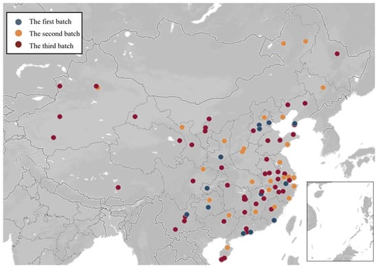 China is at a pivot point of accelerated industrialization and urbanization, and energy demand will continue to grow. In developing its economy and improving people’s livelihoods, China must also effectively control greenhouse gas emissions and appropriately respond to climate change to achieve sustainable development. China accepts the international commitment to tackle global climate change, and is committed to accelerating its green reform process, which prioritizes energy saving and emission reduction, and aims to achieve sustainable development. In this context, various positive incentives and negative penalties have been introduced and are currently undergoing intensive piloting and experimentation. Of these initiatives, the LCPP, which targets low energy consumption and low pollution, is garnering significant attention [7]. The concept of low-carbon cities is a symbol of sustainable development goals, which encourages the creation of urban areas that are inclusive, safe, resilient and sustainable, whose ecological footprint is minimized. As an important tool for controlling greenhouse gas emissions and achieving sustainable development in China, the initiation of the LCPP can be traced back to 2010, when China embarked on this ecological strategy by designating five provinces and eight cities as the inaugural low-carbon pilot areas. In establishing the initial group of pilot programs, the Chinese government chose a selection of provinces and cities to serve as pilot areas, with the objective of investigating pathways for low-carbon development tailored to the specific circumstances of China. These pilot cities and provinces should set specific emission reduction targets and establish implementation programs, with the aim of upgrading energy efficiency, developing low-carbon industries, and promoting low-carbon lifestyles. In 2012, the Chinese government, in utilizing the insights and outcomes from the initial pilot batch, widened the range of the low-carbon pilots by incorporating an additional province and selecting 28 cities as the subsequent group of low-carbon pilots. The execution of the second set of pilot projects placed a greater emphasis on establishing a carbon emissions trading scheme, enhancing and deploying technologies for energy conservation and emissions reduction, and utilizing energy sources that are both efficient and clean. During 2017, a total of 45 municipalities were designated as the third series of pilot cities for low-carbon initiatives. Policy implementation in this batch emphasized innovation and diversified pathways, such as the development of smart cities, improvement of market mechanisms, and support for localities to flexibly formulate low-carbon development strategies that take local realities into account. So far, China has set up a total of 87 low-carbon pilot regions, consisting of six provinces and 81 low-carbon pilot cities. The geographical distribution of these low-carbon pilot regions across China is shown in Figure 1.